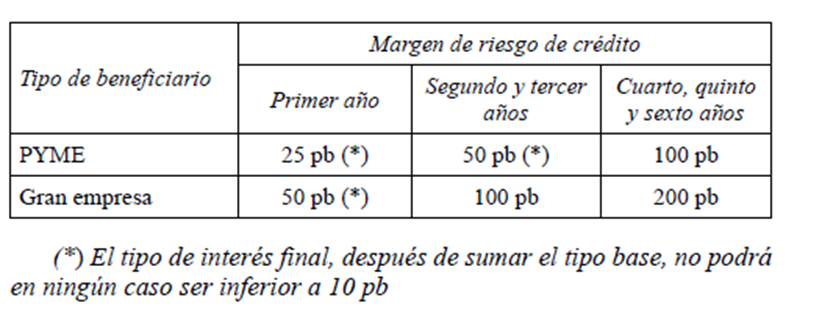 - Tipo de interés reducido, al menos igual a la suma del tipo de interés EURIBOR a un año, con límite inferior 0 % más los márgenes de riesgo de crédito establecidos en el siguiente cuadro: